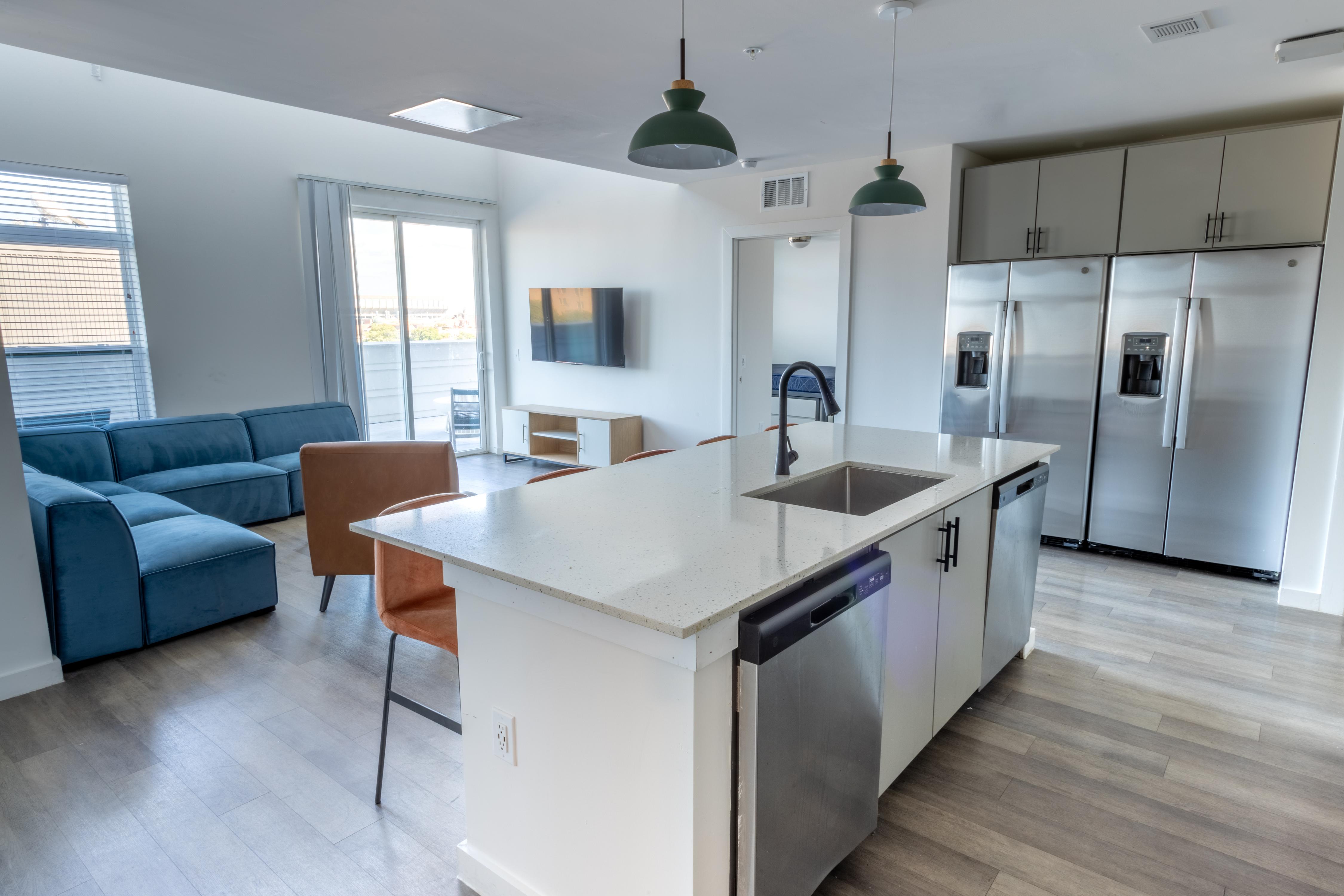 Connect all of your favorite people in one place in the Mirage. Here, you can abandon the traditional apartment layout and find yourself in a home designed to inspire unity. This two-story townhome with six large bedrooms comes equipped with a washer and dryer on each floor, double appliances (refrigerator and dishwasher) in the kitchen, double vanities in the bathrooms and a fully-furnished private terrace.