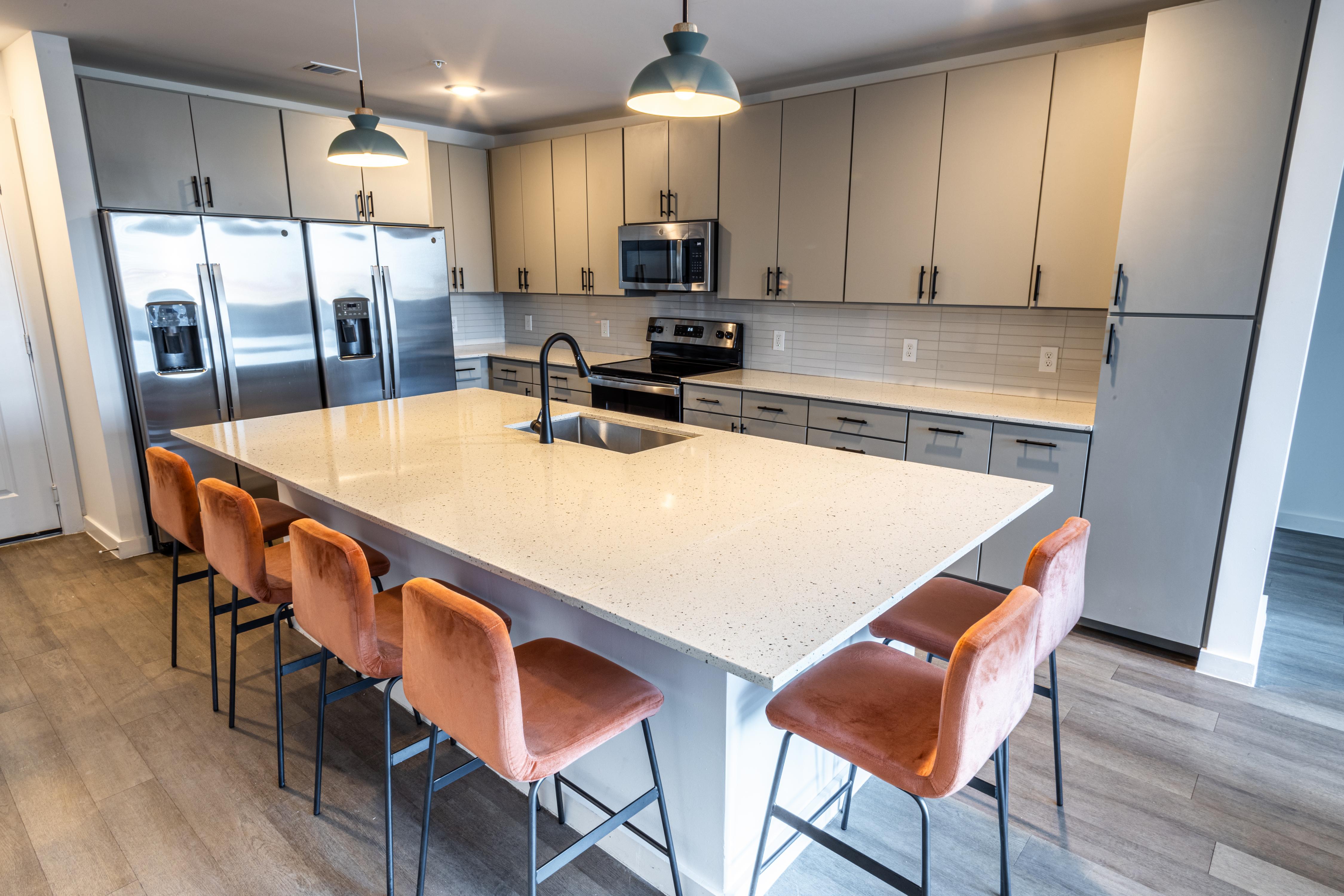 Find your haven surrounded by your people in the Oasis. This two-story townhome revolutionizes apartment living, featuring six large bedrooms. The Oasis is intentionally designed for living with all of your closest friends. You’ll live together comfortably with a living space and washer and dryer units on each floor, double appliances (refrigerator and dishwasher) in the kitchen, and double vanities in each bathroom.